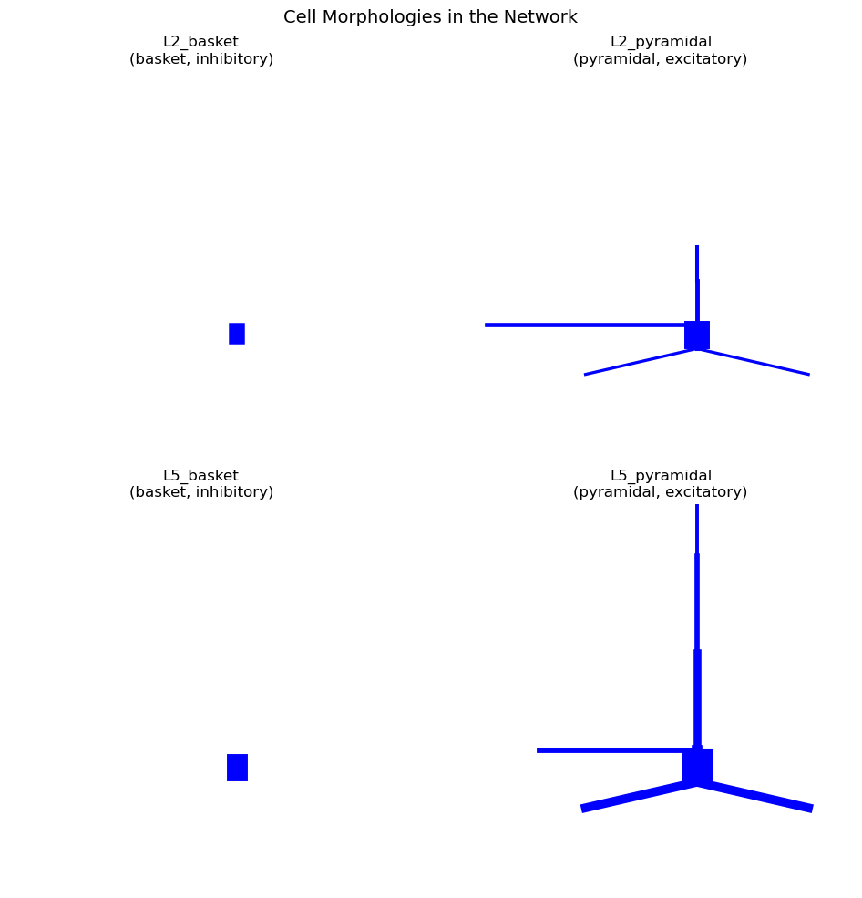 plt.suptitle('Cell Morphologies in the Network', fontsize=14, y=0.98)